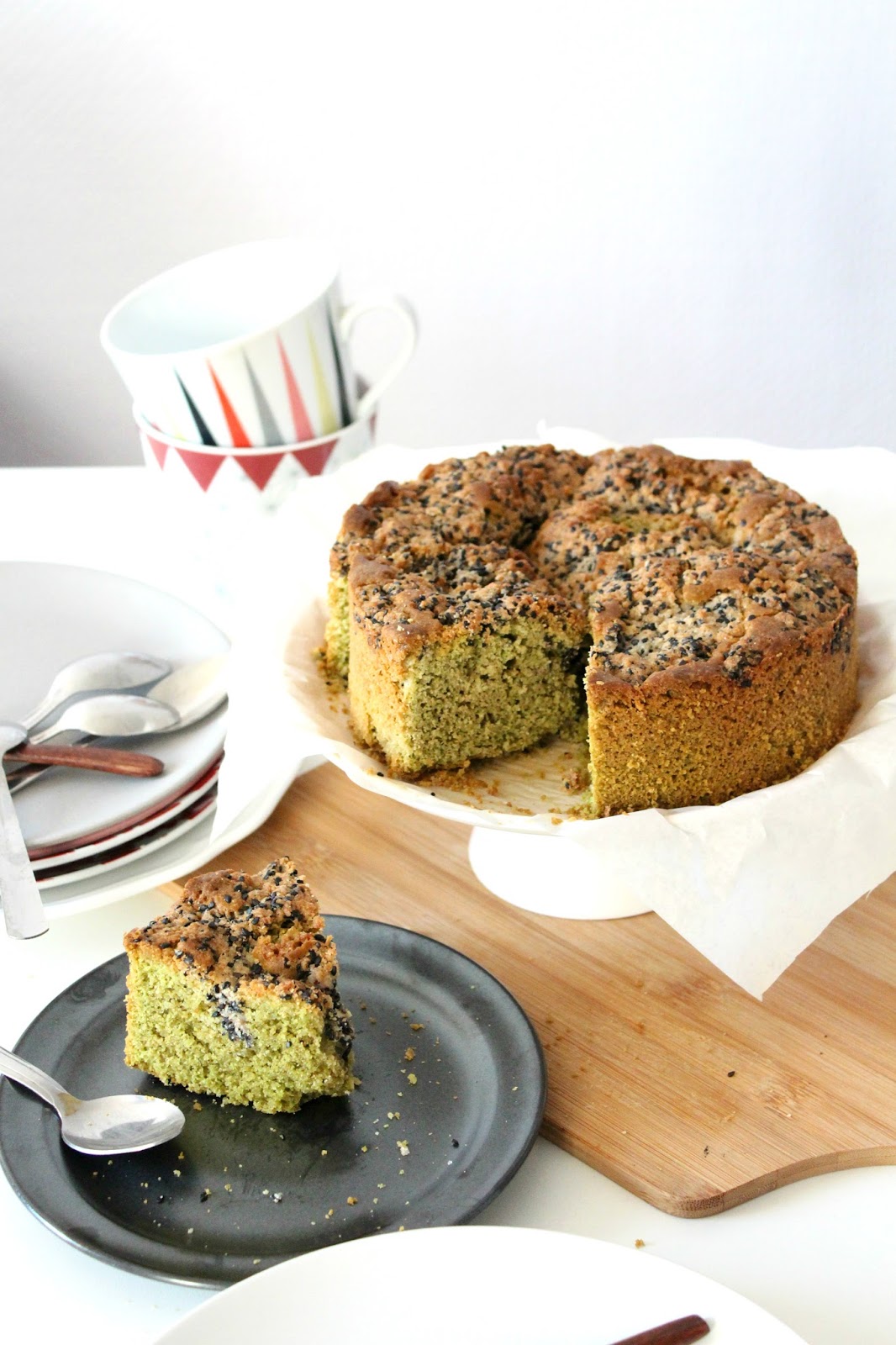 Avec le recul je pense que j’avais eu la main lourde sur les quantités de cette petite poudre. Parce que finalement quand vous utilisez du matcha pas besoin d’en mettre des tonnes. Une cuillère à café ou deux suffit amplement. J’avais du refaire une avec une tarte au poires et streusel qui était bien passé avec une légère touche de matcha. Puis a eu lieu notre voyage au Japon. Je crois que j’ai pratiquement mangé des mets au matcha tous les jours. En glace, dans les brioches, dans les angel cakes, un peu de partout. Depuis notre retour je peux dire que j’apprécie enfin réellement cette saveur. Et comme nous sommes revenus avec quelques sachets de poudre matcha à cuisiner il me fallait réssayer. Pour cette recette on peut dire que le matcha et la poudre d’amande se marient à merveille. Evidemment la dose de sucre adoucit le matcha et le streusel au sésame noir complète vraiment bien le gâteau.