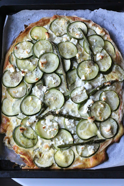 Salez, poivrez, disposez la moitié des courgettes et des asperges dans le fond de la tarte.