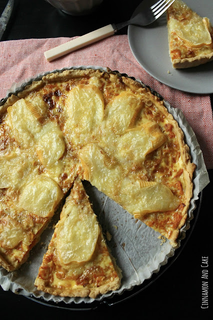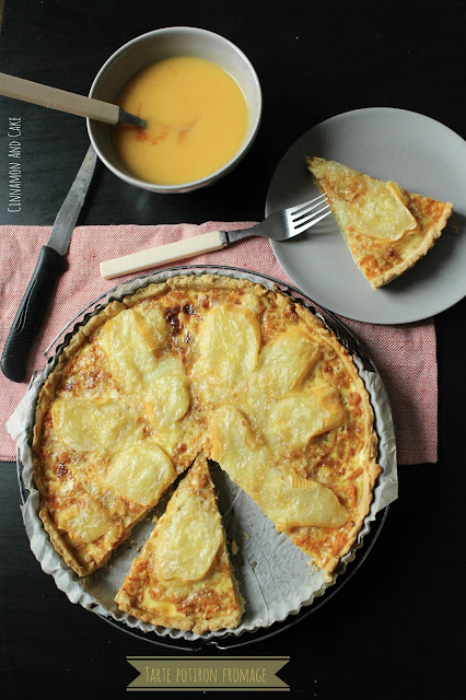 Enfournez la tarte pendant 20 min, coupez le fromage en fines tranches pendant ce temps puis déposez-les sur la tarte qui repart ensuite au four pendant encore 20 min de cuisson