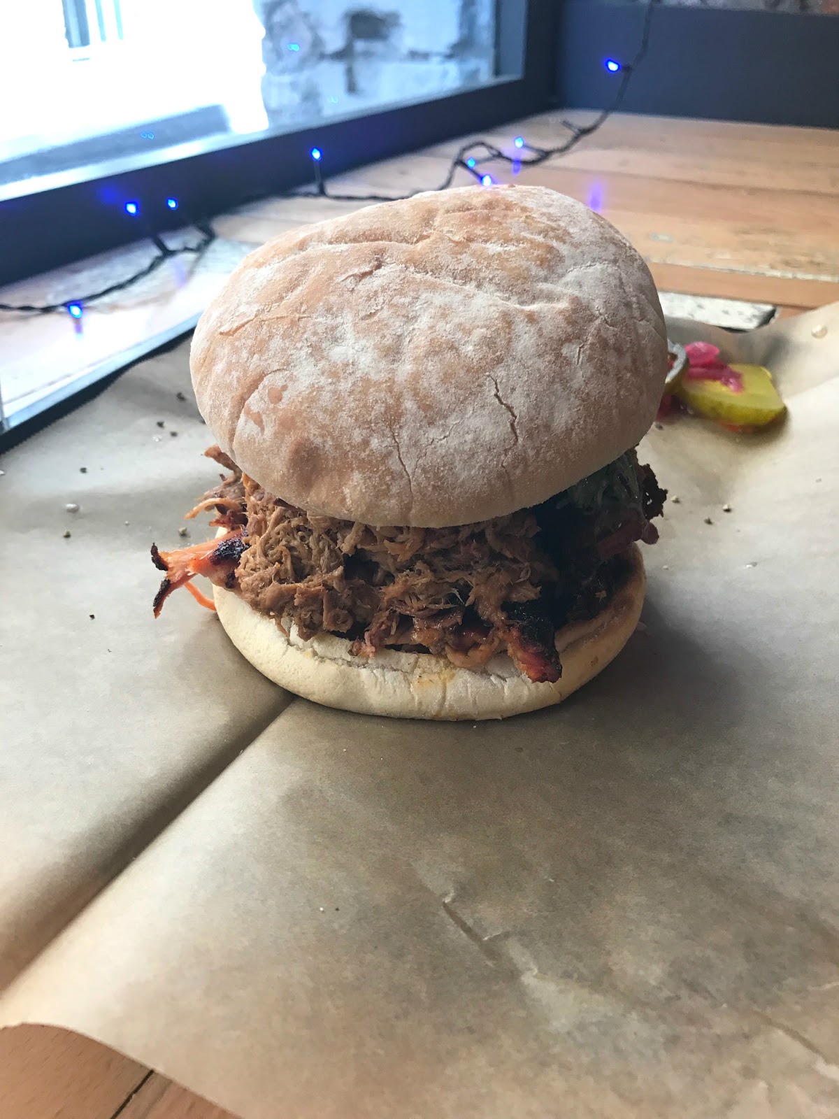 Ici pas d’assiette, le sandwich est posé sur un plateau. La viande du pulled pork sandwich est juteuse, effilochée, tendre et bien épicée. Accompagnée de chou rouges, pickles et de pommes de terre cuites aussi dans le fumoir. Pareil pour le sandwich à la poitrine de porc, celui-ci est bien cuit et assez fumé. La première bouchée, vous donne l’impression d’avoir atterri dans le pays de l’oncle Sam. Concernant la provenance des viandes, le porc est issue de France avec parfois de l’approvisionnement en porc de Bigorre. Sur le boeuf on est sur du Black Angus américain.