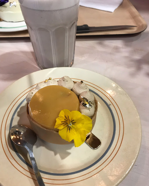 Dans nos assiettes : Cette fois nous avons opté pour Berenice et Viviane et du chai latte. La première avec sa purée de banane et fruits exotiques, brioche imbibé au rhum et ganache Dulcey. La seconde avec son croquant de riz soufflé et chocolat, biscuit cuillère, marmelade de cassis, crème anglaise à la vanille de Madagascar. Même pour cette fois-ci je n’arrive pas à savoir laquelle des deux j’ai préféré.