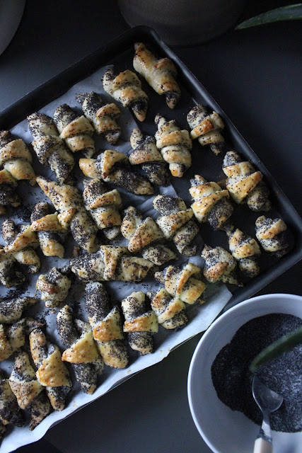 Saupoudrez le disque de mélange sucre/pavot puis coupez 8 ou 10 triangles de pâtes. C’est un peu comme vous voulez, si vous préférez des petits ou gros croissants