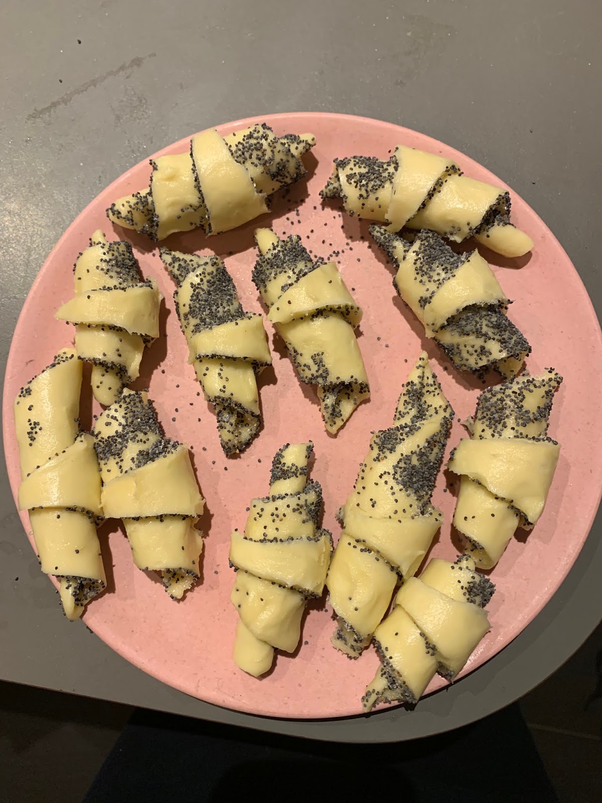 Remettez les croissants au frigo pendant 30 min puis badigeonnez les d’oeuf battu puis enfournez 30 min à 180°C