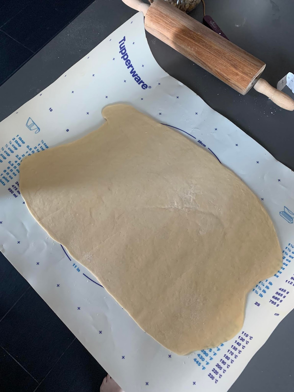 Farinez votre plan de travail et travaillez le premier morceau en l’étalant en un rectangle de 30 x 40 cm
