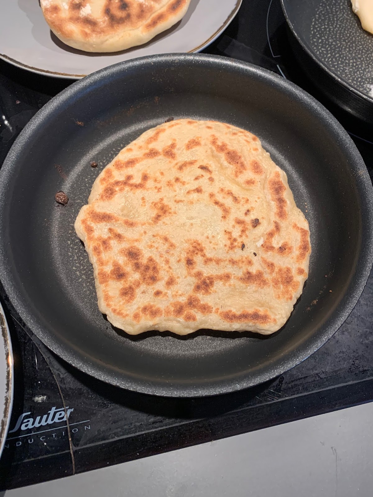 Faites chauffer à feu vif dans une poêle pendant 3 min de chaque côté, pas besoin d’ajouter de matière grasse. Veillez bien à ce que les naans ne deviennent pas noir , cela voudrait dire que votre feu est trop fort
