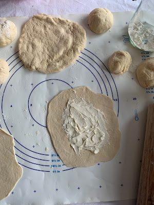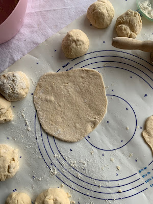 Avec votre rouleau à pâtisserie vous étalez chaque boule en disque fin (2 /3 mm d’épaisseur )
