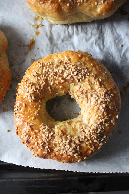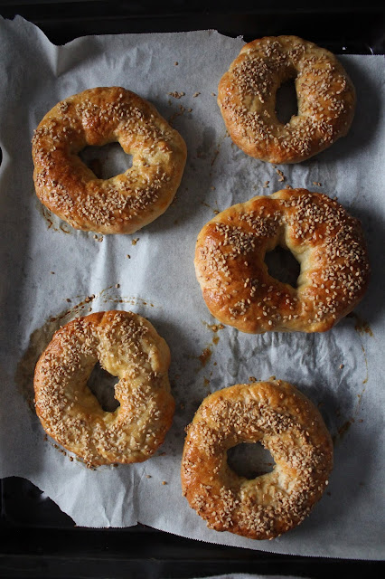 Une fois les 8 bagels fait, déposez les sur une plaque de cuisson recouvert d’un papier et déposez par dessus du film plastique : laissez reposer au frigo pendant 30 min , les bagels vont encore gonfler