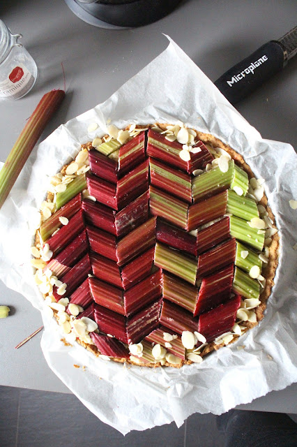 Coupez votre rhubarbe en tronçons et déposez les sur la frangipane, vous devez obtenir des motifs à chevrons ( ça m’a pris un peu de temps de mon côté) , puis disposez les amandes effilées autour