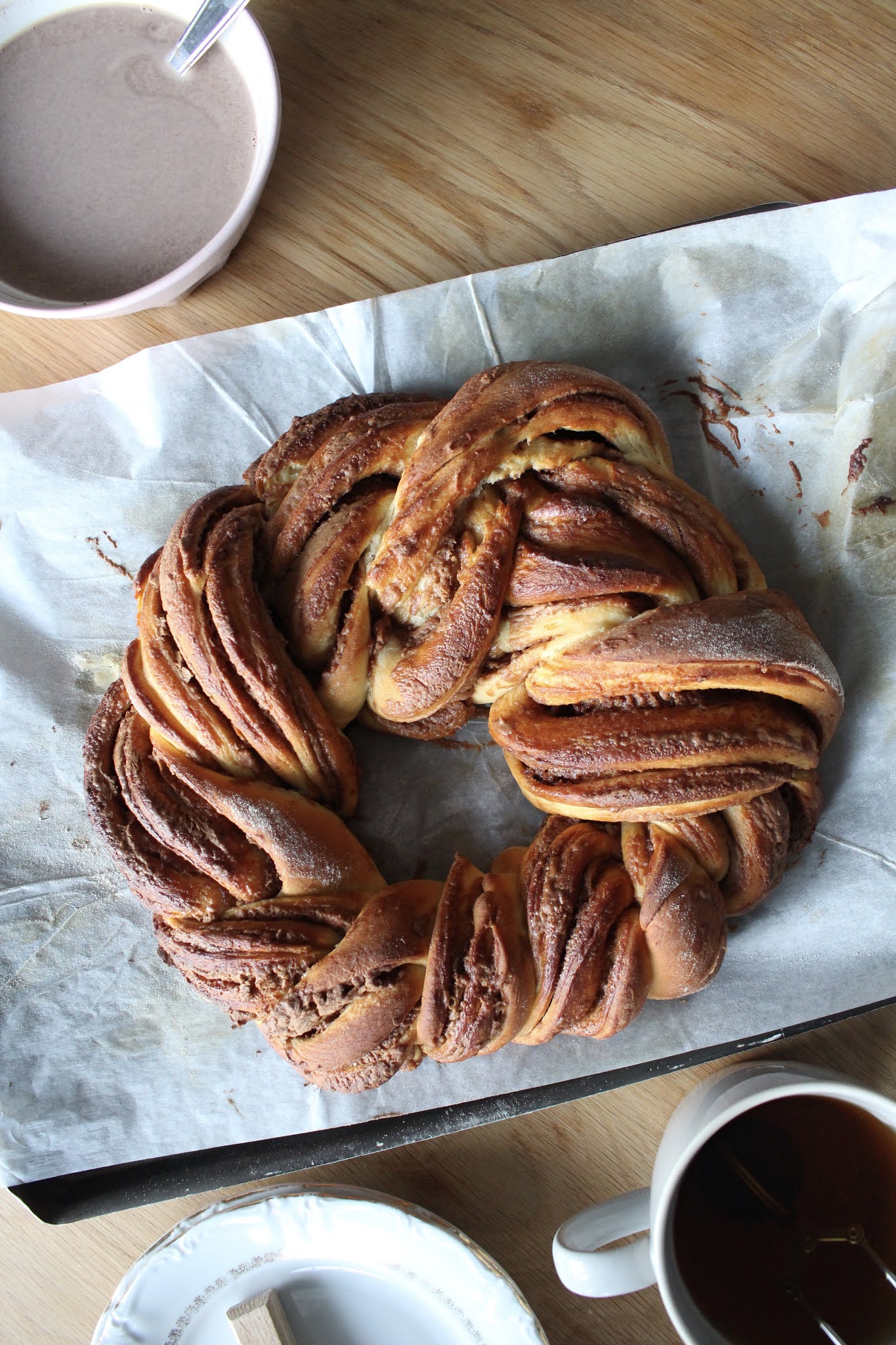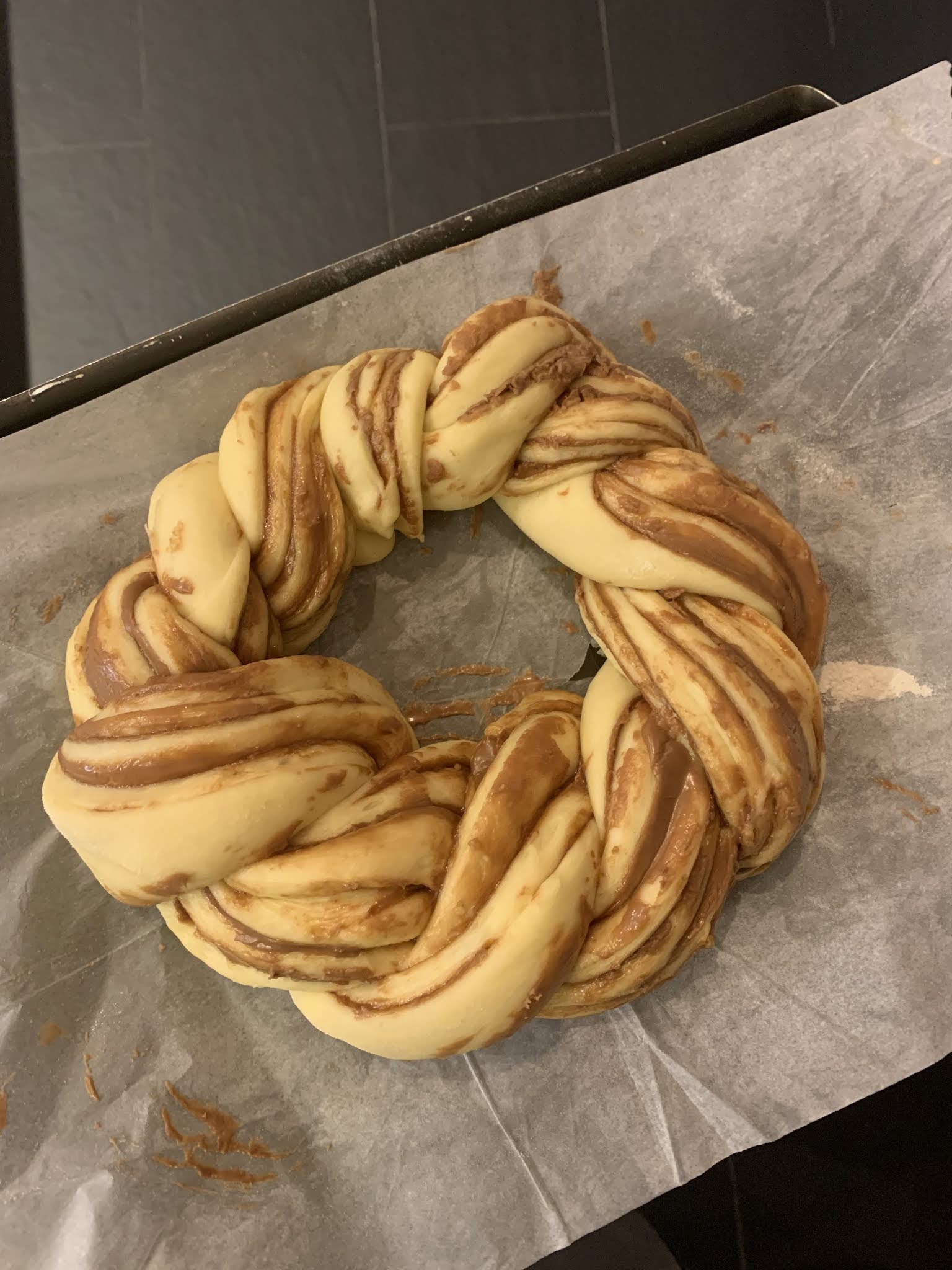 Recette de confinés du dimanche, on continue avec cette fois de la brioche. Cette fois cette brioche est garnie de chocolat Pralinoise, ça lui donne un côté très réconfortant. Ici elle est validée. Si vous souhaitez vous pouvez même ajouter un glaçage au sucre dès que vous la sortez du four mais j’avoue qu’à 23h passé, je n’en avais plus trop envie.