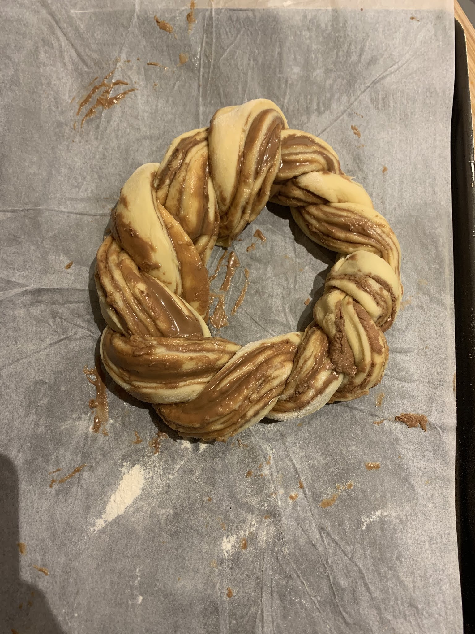 Roulez la pâte en un boudin, coupez le en deux , puis faites un X avec le milieu des deux brins et tressez-le