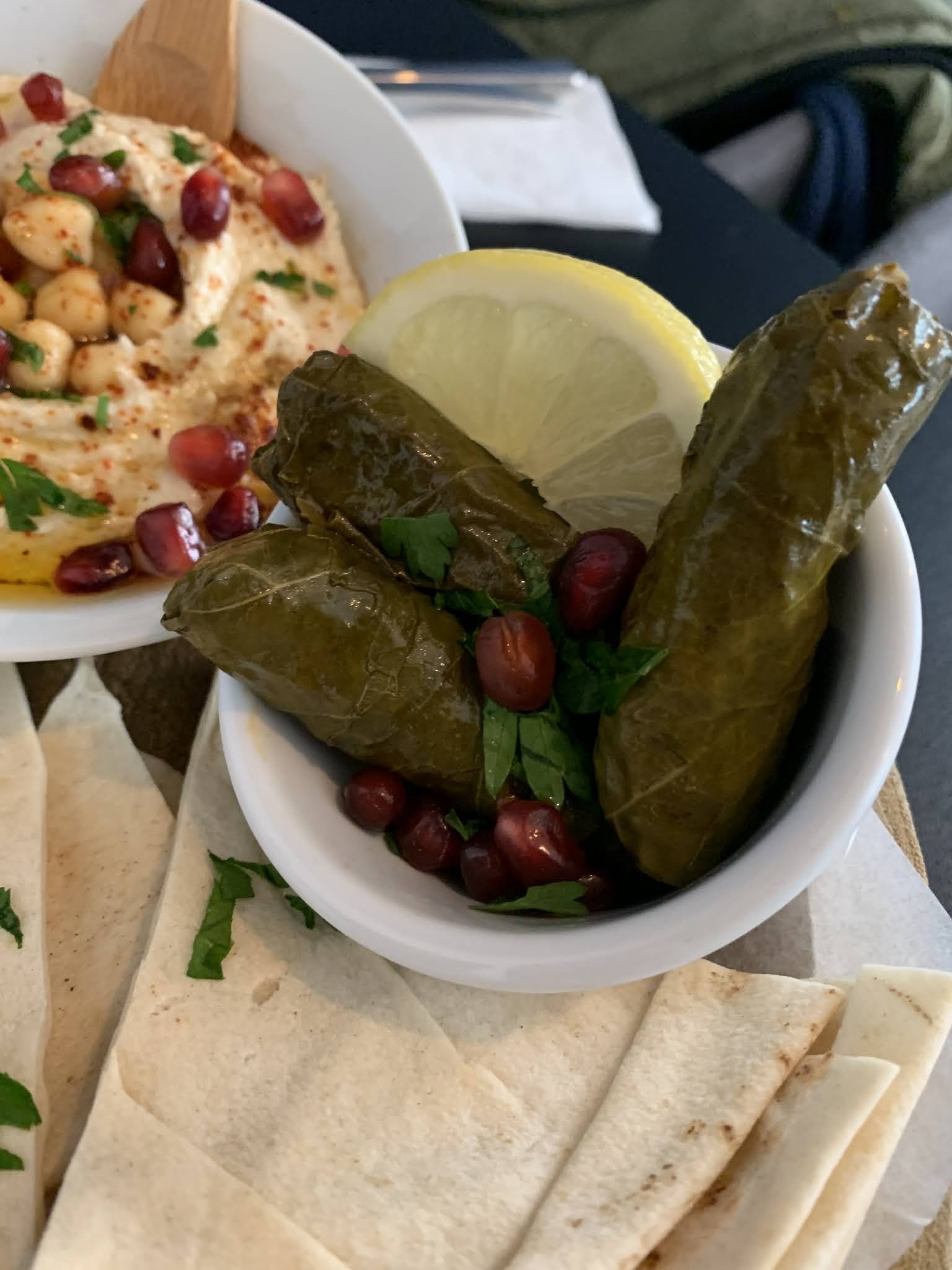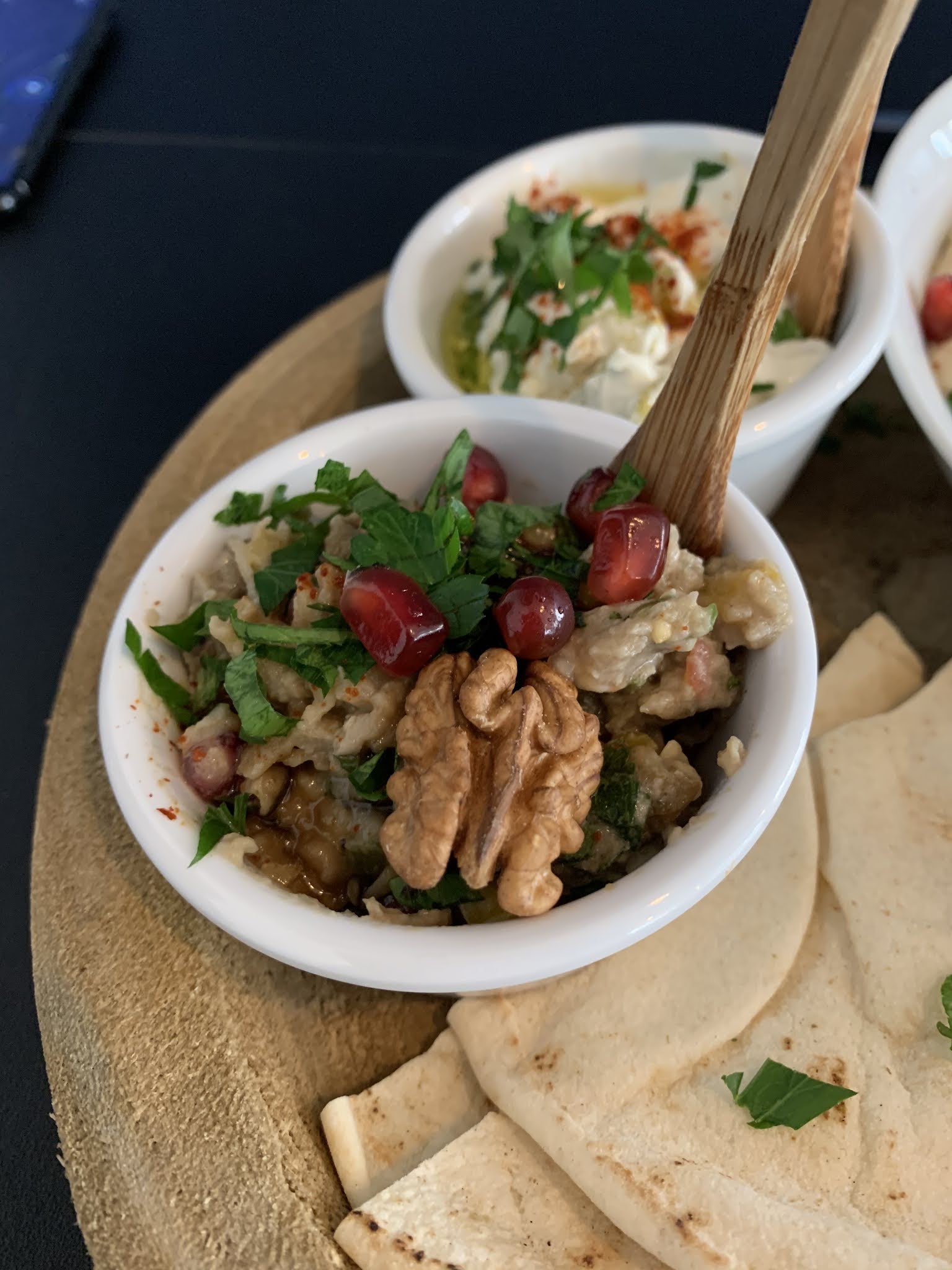 Mezzes froids : Du hummous , feuilles de vignes ,  baba ghanouj (caviar d’aubergines) , courgettes tarator