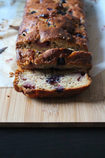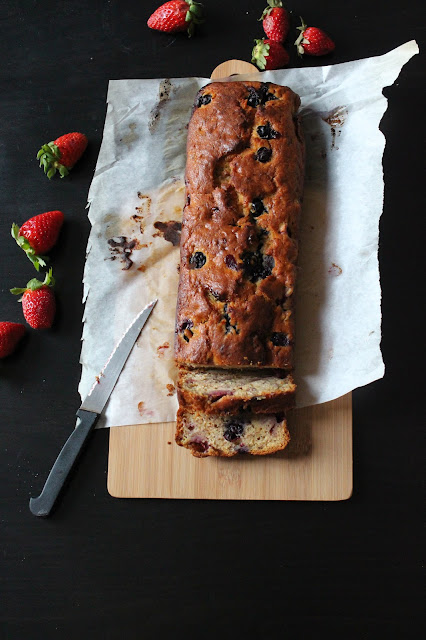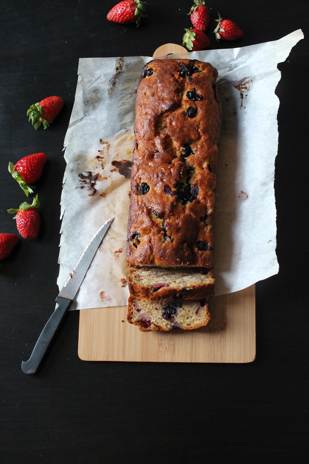 Des fruits, il me faut des fruits. Bon il faut avouer que je ne prends zéro risque en vous proposant cette recette parce que finalement il y a très peu de chance de louper ce cake. J’aime bien le mariage de la banane, des fraises et des myrtilles. Autant la banane est réduit en purée donc on ne sent que le gout mais j’aime beaucoup les morceaux de fruits ici les fraises et les myrtilles. Finalement ça change un peu du chocolat surtout en chaude période d’été. En principe je cuisine ces types de cake plutôt pour le petit déjeuner. Pas trop sucré et plus rapide à faire qu’une brioche même si je préfère dix milles fois prendre mon petit déjeuner avec de la brioche. Deux tranches au petit déjeuner, deux tranches au gouter , c’est bon le cake aux fruits ne fait pas long feu. Promis dimanche je vous poste une recette de brioche. Dernière précision la recette provient du blog de Julia.