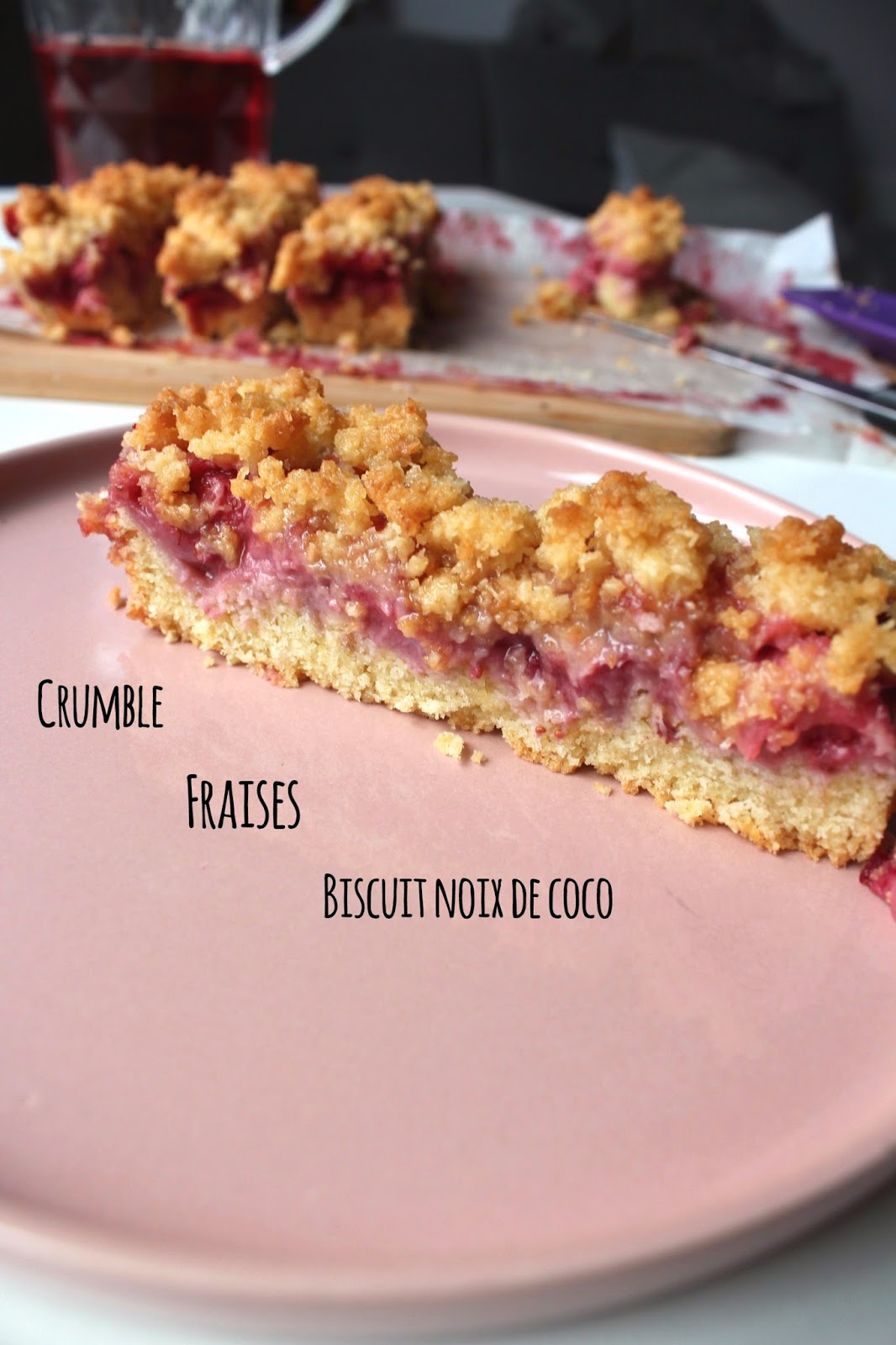 Initialement la recette indiquait des framboises, à la place j’ai ajouté des fraises. Sans regret puisque l’association fraise et noix de coco fonctionne très bien. Une fois refroidi, vous coupez en barres rectangulaires et vous voila prêt. Par contre les quantités sont pour quatre-cinq convives et guère plus. Si vous le souhaitez vous pouvez remplacer les fraises par des pêches ou des abricots. Et si quelqu’un a une recette de fraisier qui tient la route, je suis toute à fait preneuse !
