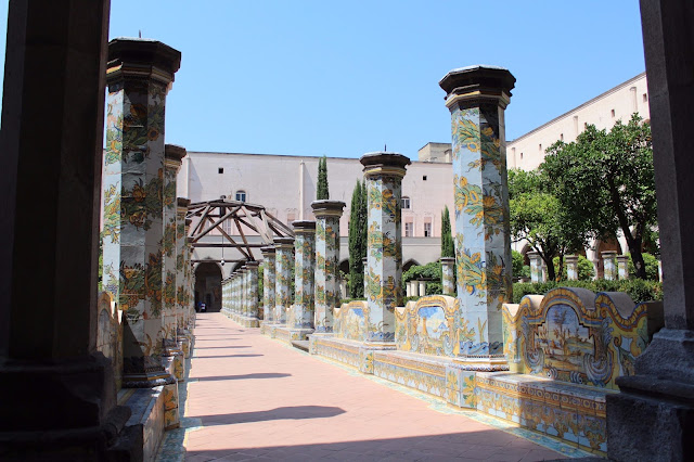 Basilique Santa Chiara : Monastère gothique avec son cloitre et ses mosaïques. Les allées qui divisent le jardin sont bordés de colonnes octogonales. Des citronniers et lavandiers ornent le jardin.