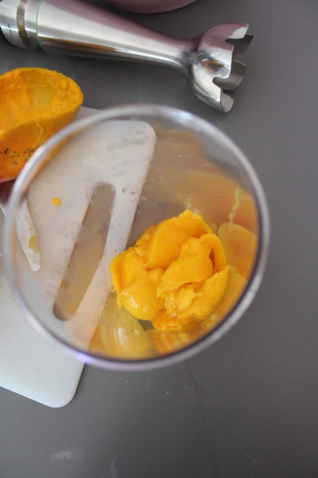 Coupez la mangue en 2 et on la passe au mixeur plongeant , vous devez obtenir une purée