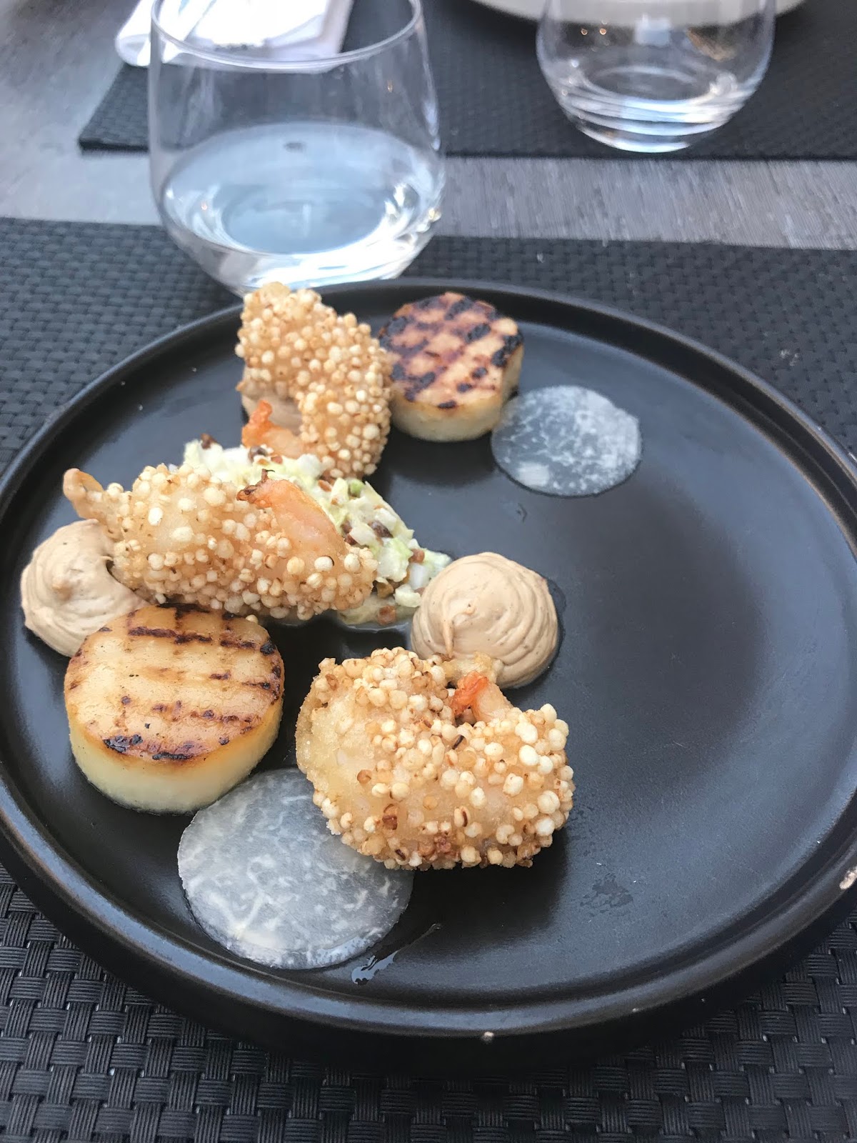 Fantastique repas chez Arsenic en compagnie de ma douce Charlotte. Nous étions à la recherche d’un restaurant à la fois ouvert et ayant aussi la clim. Chose pas simple en plein aout puis finalement une table s’est libérée en fin de journée. Dans l’assiette une tempura de gambas délicieuse avec une sauce au tamarin qui relève le tout. La panure au quinoa soufflé est une super idée. Ensuite nous sommes partis sur le ris de veau. Cuisiner les abats est un exercice périlleux car c’est soit on aime ou on aime pas. Un ris de veau bien cuit dans son jus avec des courgettes sous différentes formes. C’était très bon. Puis nous avons terminé avec un dessert au chocolat, framboise et estragon.