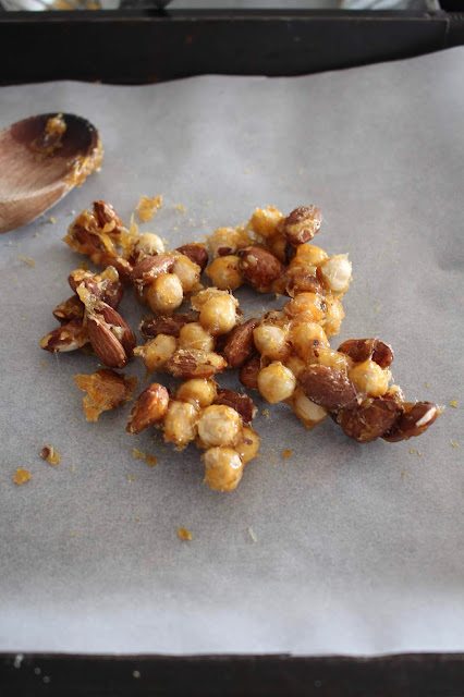 Lorsque le sirop devient un caramel clair , ajoutez les amandes et les noisettes ; mélangez avec une cuillère en bois puis transférez le tout sur un papier sulfurisé