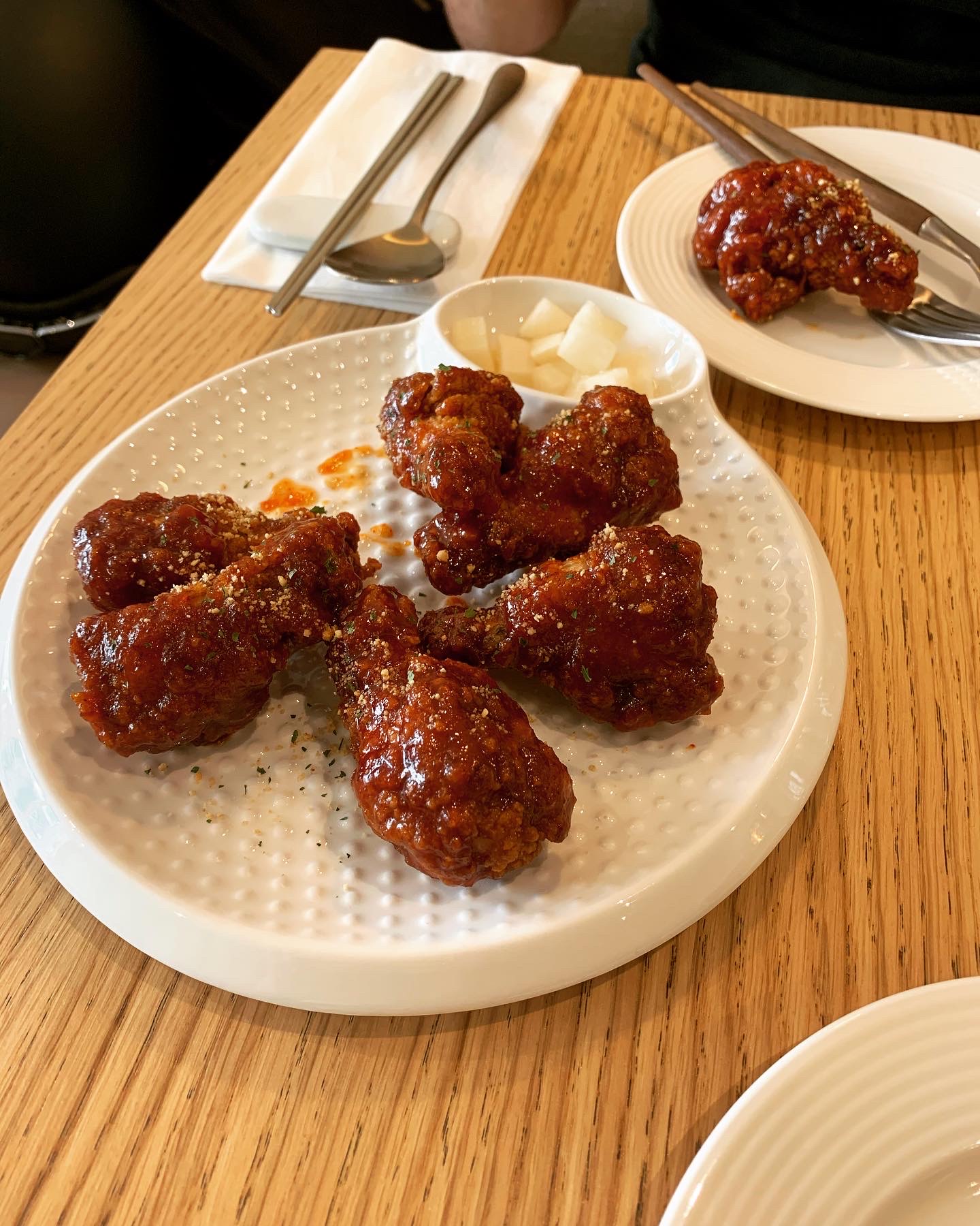 En entrée un Dak GangJung , du poulet frit à la sauce soja sucrée et salée (9 euros les 6 pcs)
